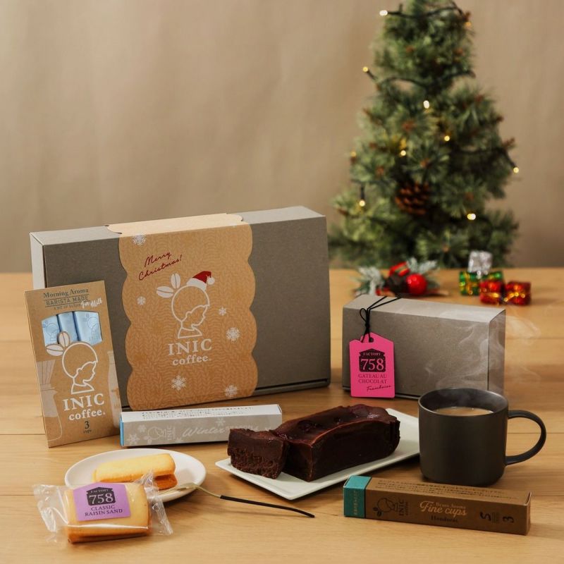 クリスマス気分が高まる、少し上品で大人なスイーツ2種とスイーツに合うコーヒー3種のセット。
