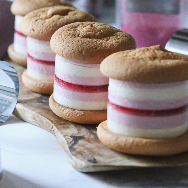 クランベリーパウダーで【レアチーズサンドブッセ】をお作りいただきました。