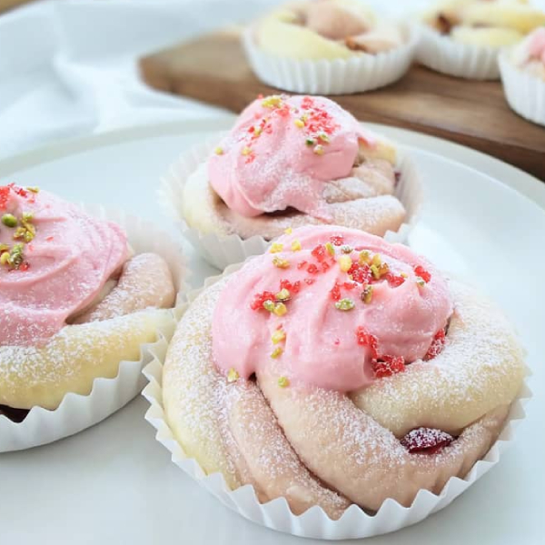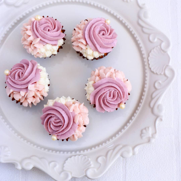 トッピングのフロスティングクリームにもクランベリーパウダーで可愛らしく色付けされています。やさしい自然のピンクの色合いがとってもかわいいです♪
