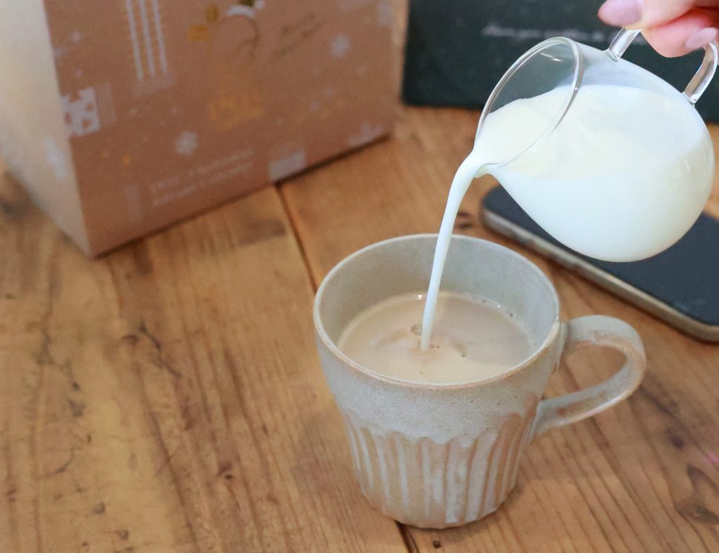 Point: いきなり牛乳を入れるのではなく、少量の湯でパウダーを溶かすことで、香りを立たせてから牛乳を合わせるのがコツです!