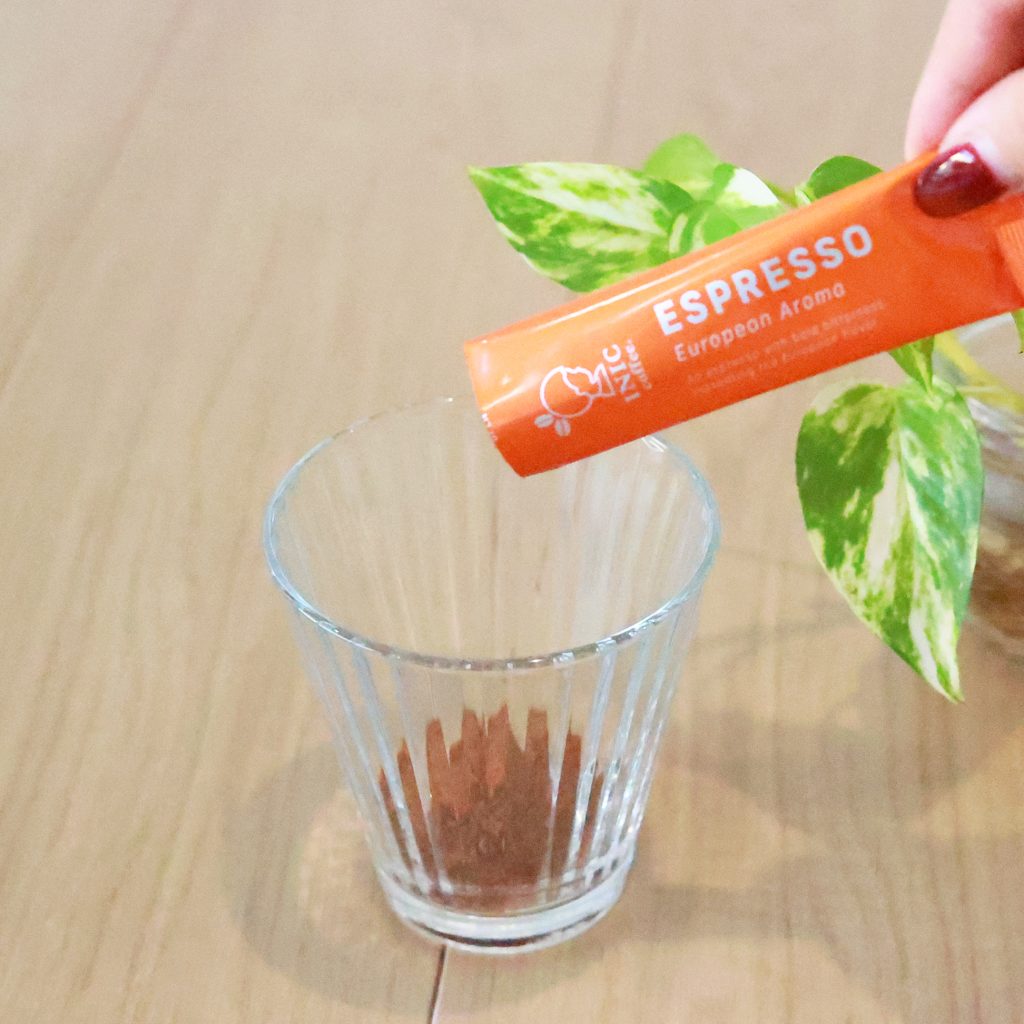 使用するのは、本場イタリアの味を追求した「エスプレッソ European Aroma」。通常は30mlのお湯で溶かしてクイッと飲む濃厚なタイプですが、これを少し多めに100mlのお湯で割ります。さらに氷で冷やすことで、クリアで香り高い「アメリカーノ」に変身します。