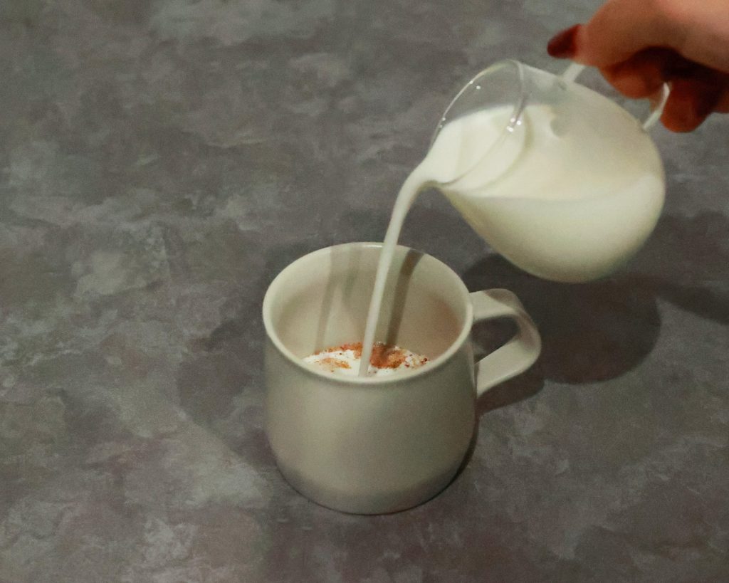 ②温めた牛乳150mlを注ぐ(600Wのレンジで1分30秒ほど加熱)