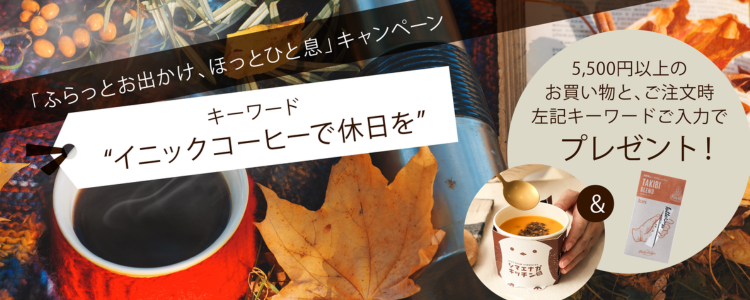 条件 | 5,500円以上のお買い物時に、備考欄にキーワード「イニックコーヒーで休日を」を記載 |