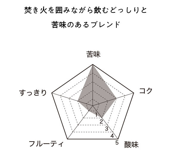 キャンプでたき火を楽しむシーンにおいしく飲めるよう、インドネシアとコロンビアなどのコーヒー豆をブレンド。仲間とたき火を囲みながら、ゆっくりとコーヒーを楽しめるような味わいに仕上げました。